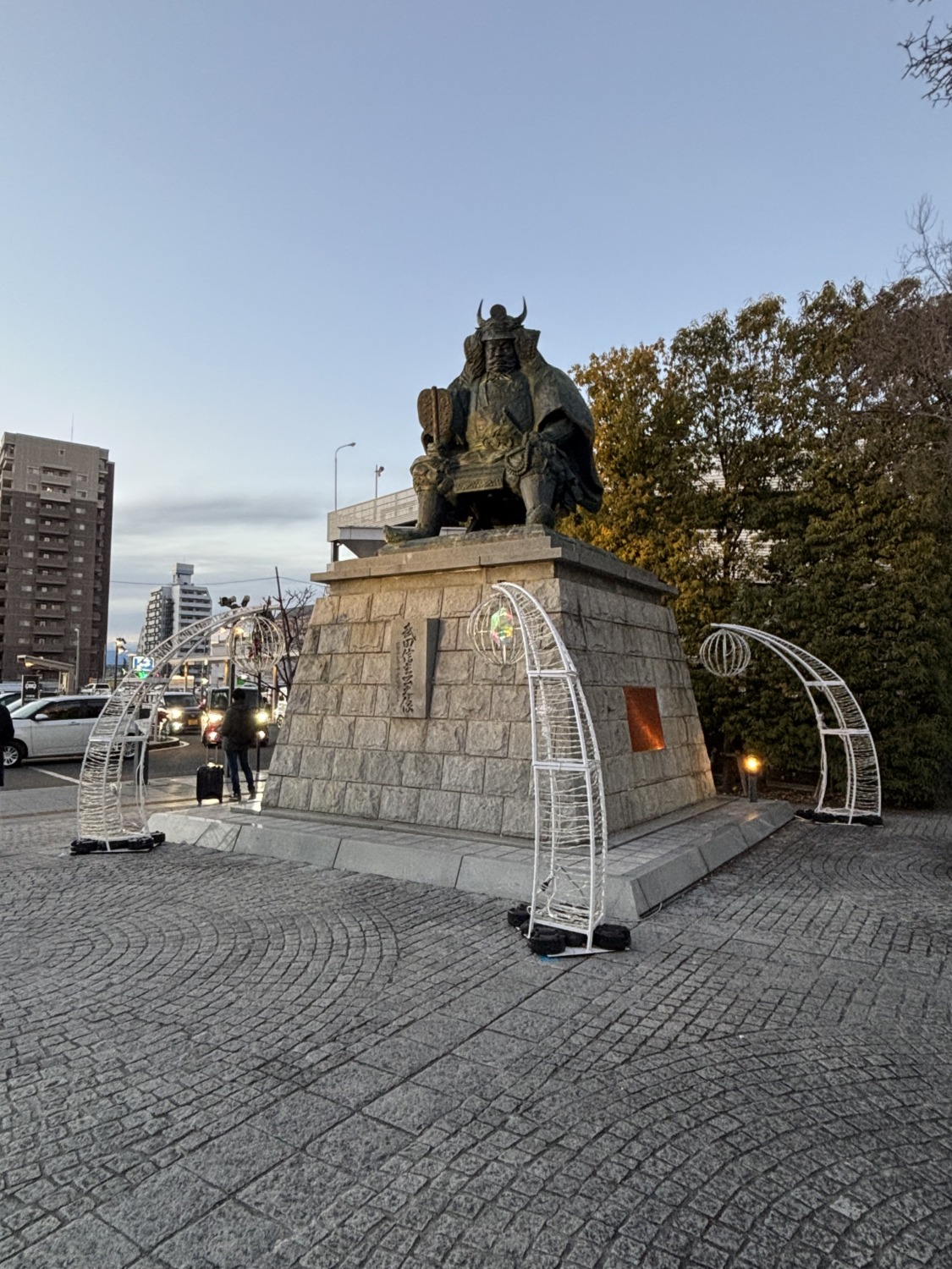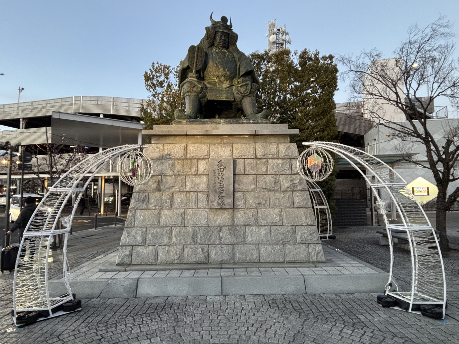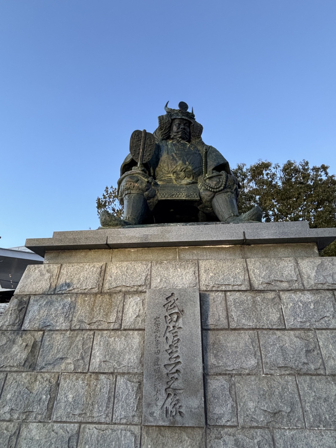 そして甲府駅南口に立つ武田信玄公銅像は、甲府市・山梨県の象徴的存在。川中島の戦いの陣中を想起させるその姿は、戦国時代の名将にふさわしい堂々たる風格を備えています。高さ3.1メートルの像は、下から見上げることで一層の迫力を感じさせます。春には両脇に桜が咲き誇り、凛と立つ信玄公との対比が美しく、定番の記念撮影スポットとして多くの人が足を止めます。